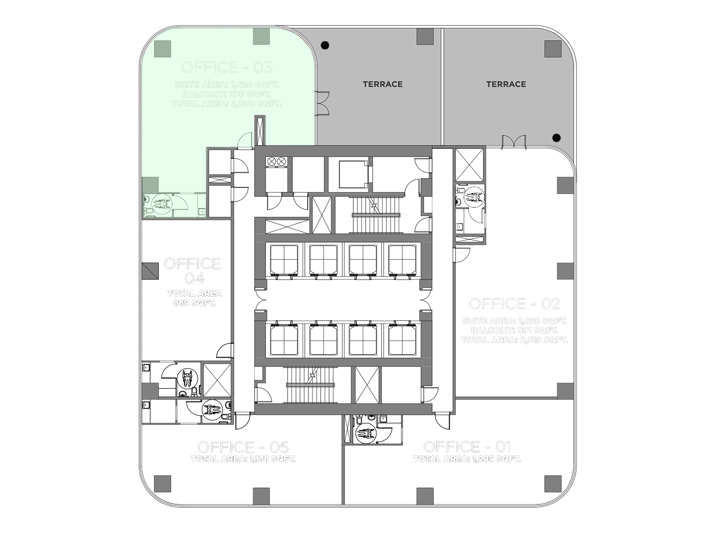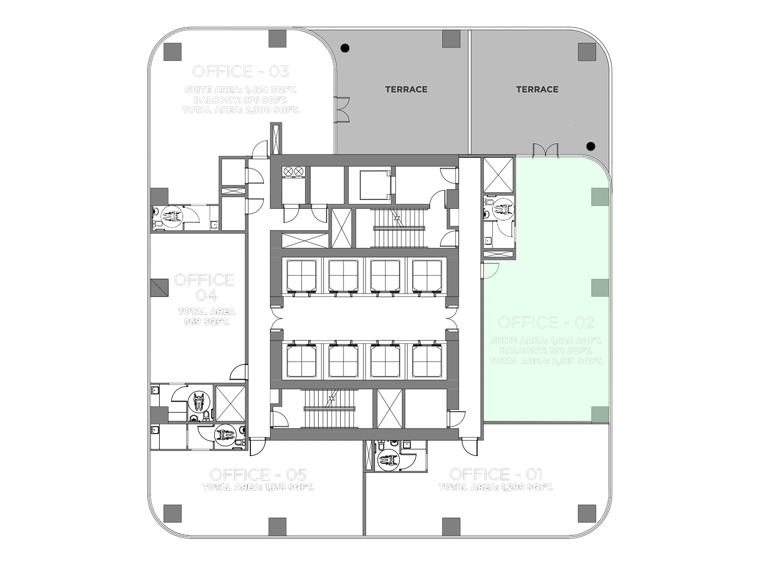 - Private expansive terraces for select offices – enjoy outdoor space and panoramic views.